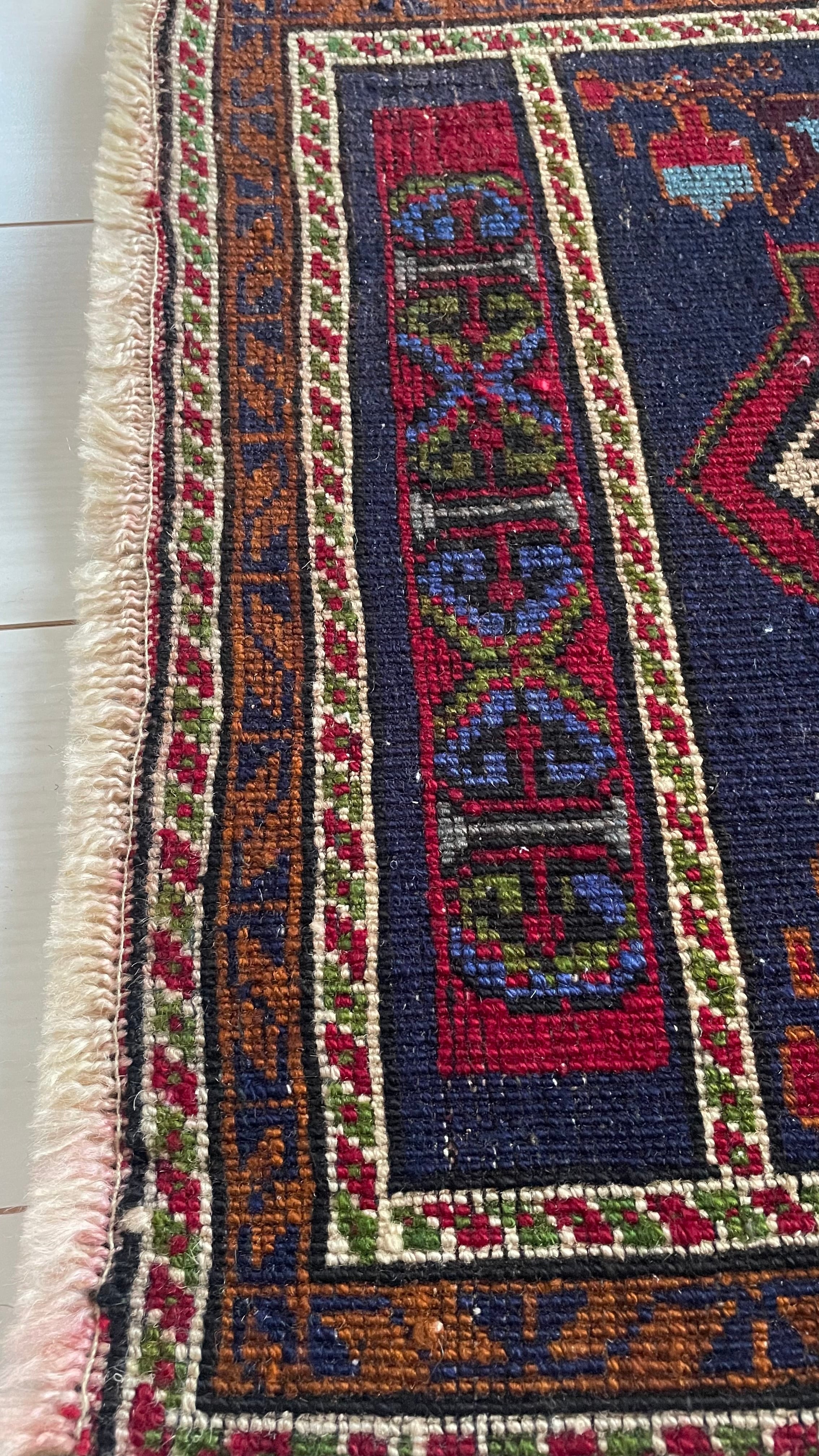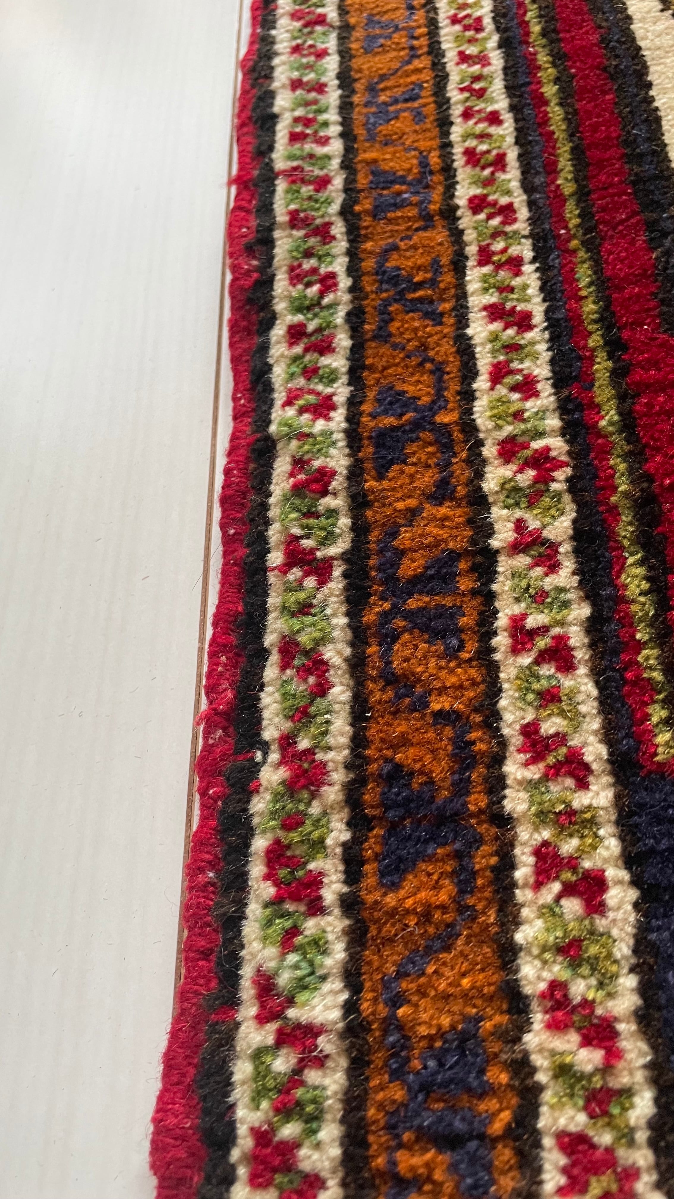 絨毯左右のヒラヒラした部分をフリンジといいます。フリンジ部分には何本か綺麗な色が混ざっています。一点物の特別感があります。